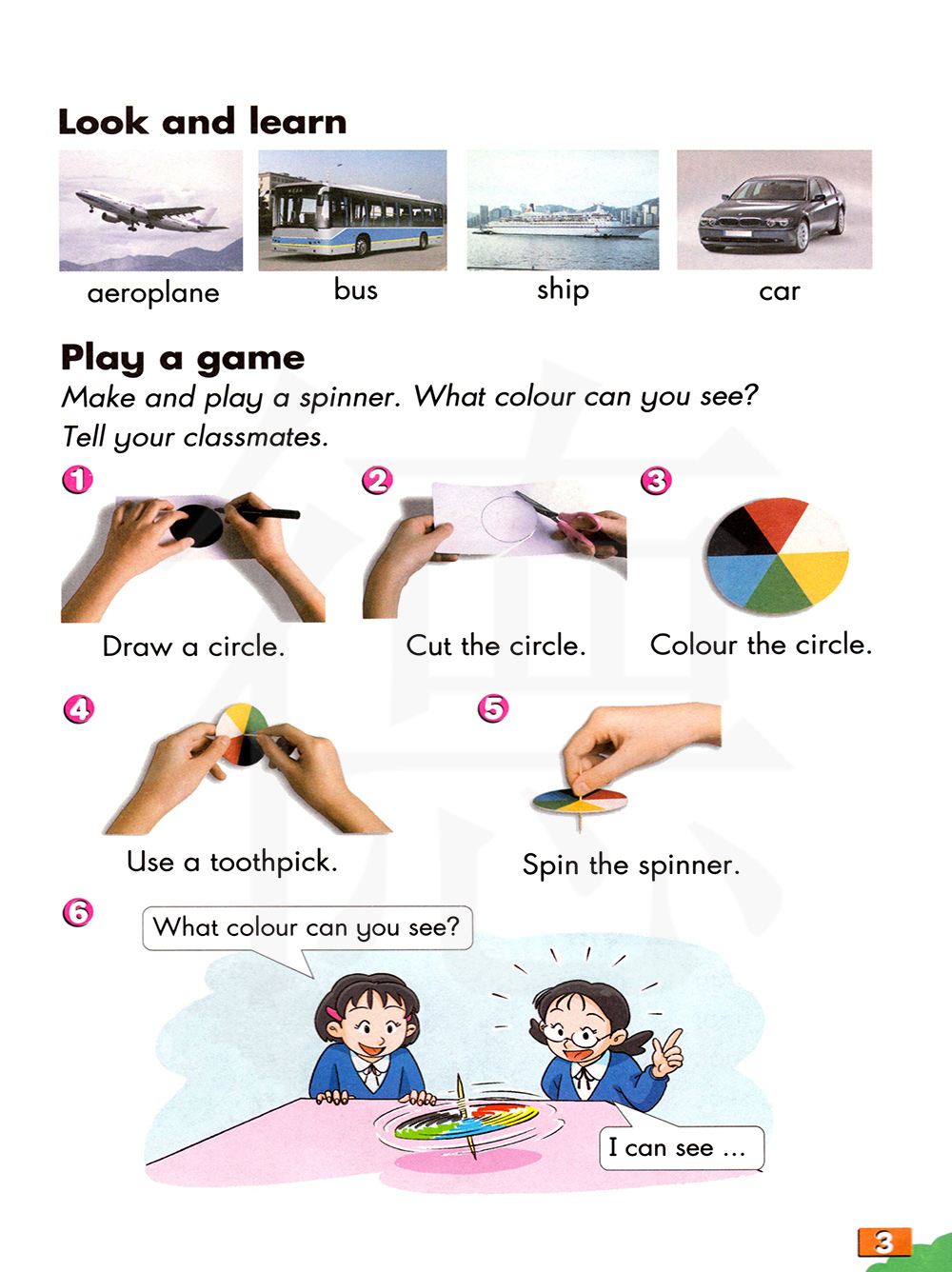 制作一个旋转指南针,然后玩一玩。你能看见什么颜色呢?告诉同学们。
