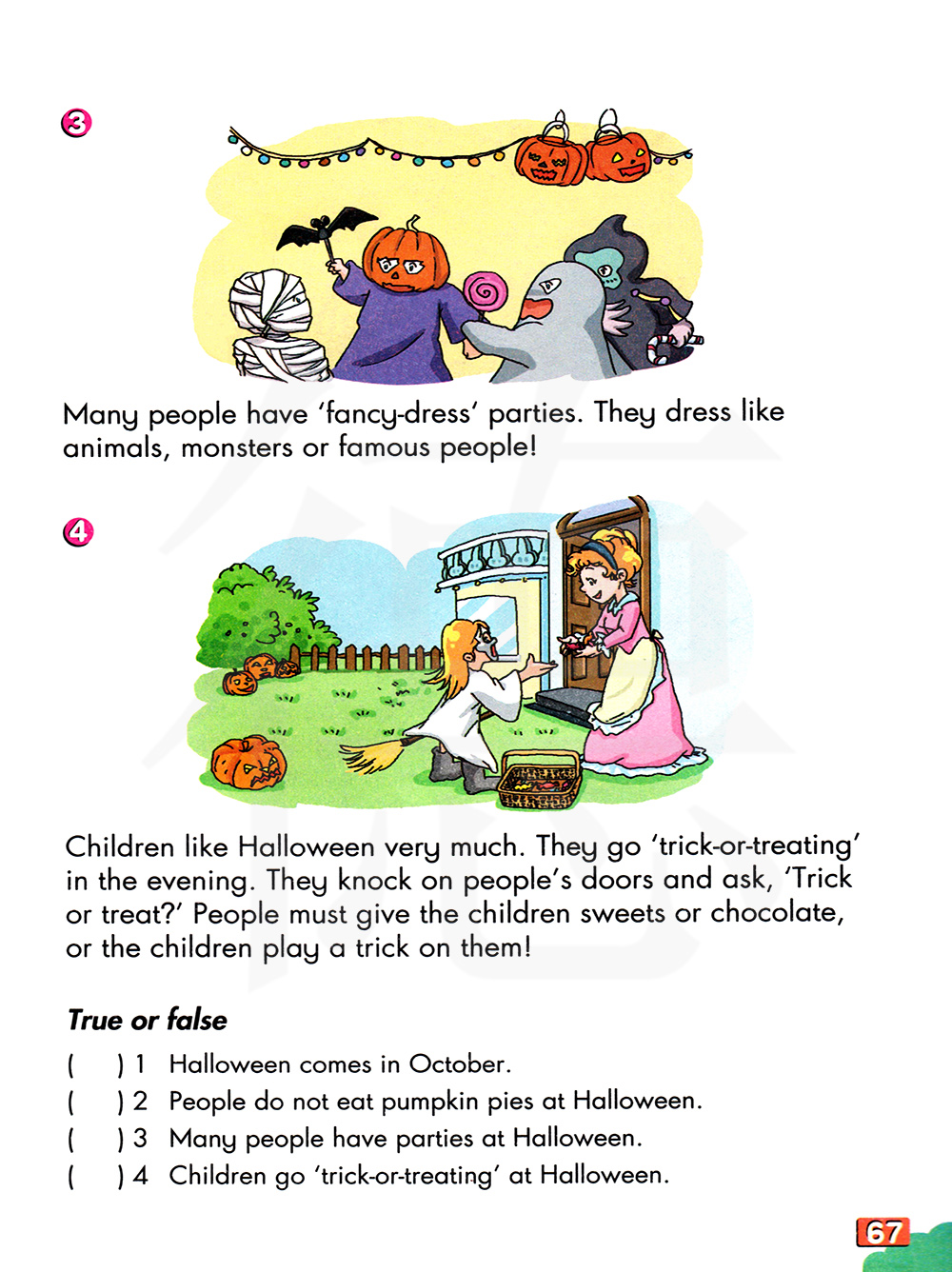 3 许多人在万圣节举行聚会。4 万圣节前夜,孩子们去玩“不给糖就捣蛋”的游戏。