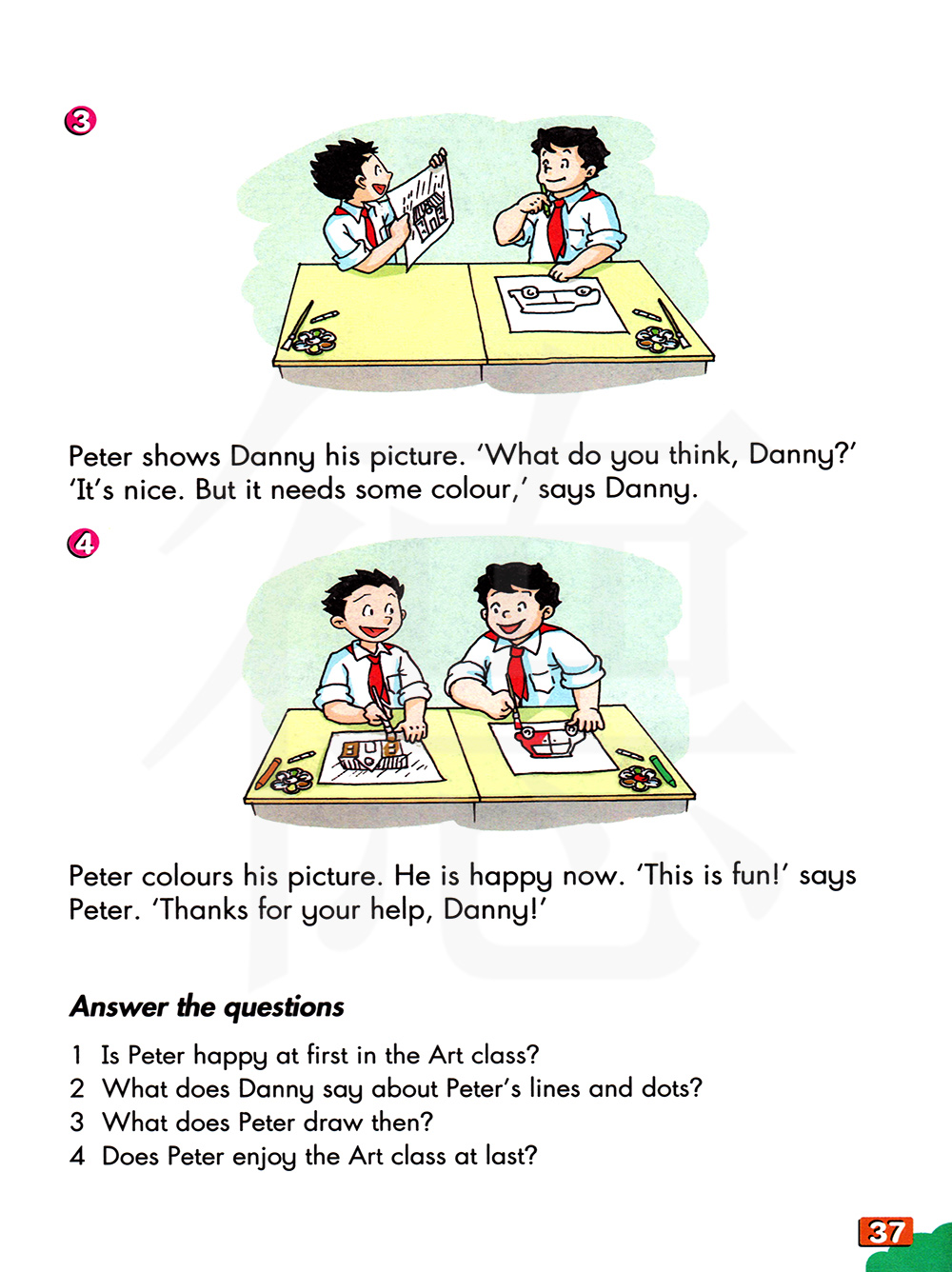 彼得给丹尼看他的照片。“你觉得怎么样,丹尼?”“这很好。但它需要一些色彩。” 丹尼说。