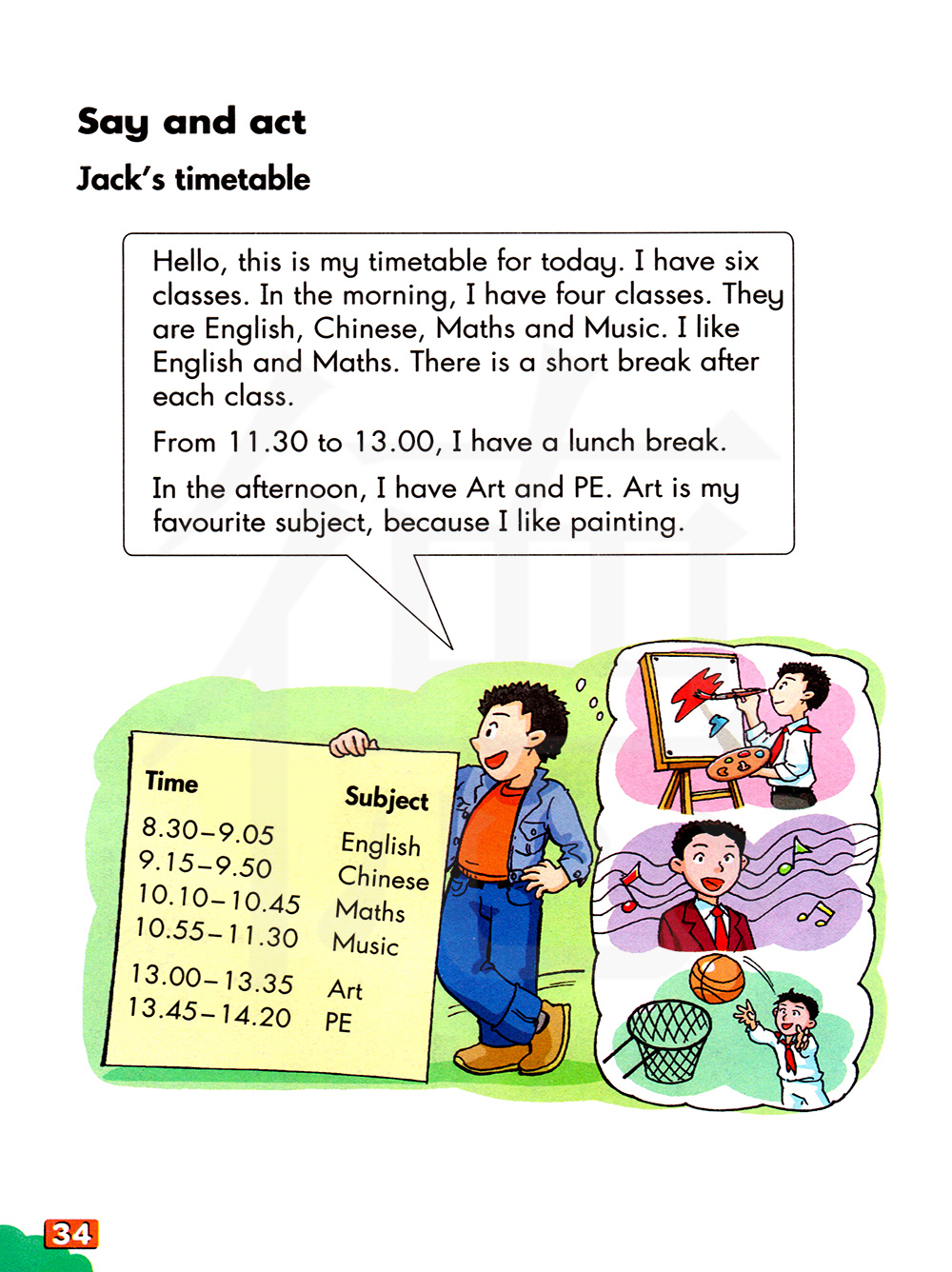 喂,这是我今天的时刻表。我有六节课。早上,我有四节课。它们是英语、语文、数学和音乐。我喜欢英语和数学。每节课后有一个短暂的休息。从11.30到13.00,我有一个午休时间。下午,我有美术和体育。美术是我最喜欢的科目,因为我喜欢绘画。