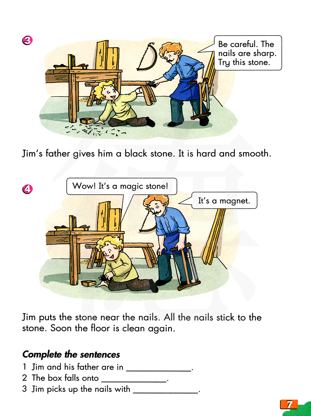 吉姆把石头放在钉子的附近。所有钉子都粘到石头上。很快地板又变干净了。