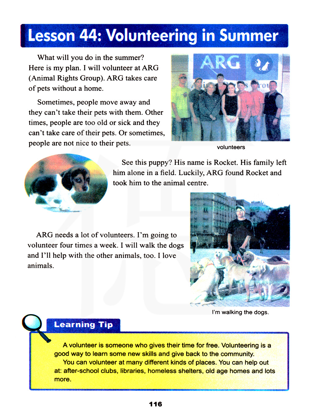 你暑假打算做什么?这是我的计划。我打算去动物权益保护协会做义工。动物权益保护协会照顾那些无家可归的动物。