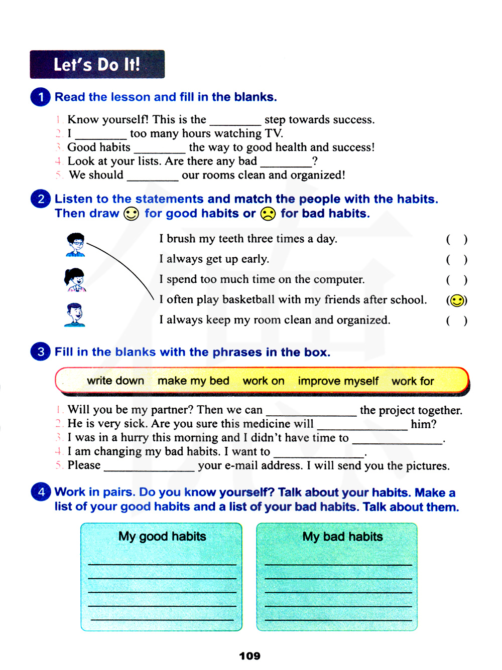 听句子并把人物和对应的习惯连接起来。然后为好习惯画一个笑脸,未还习惯画一个哭脸。