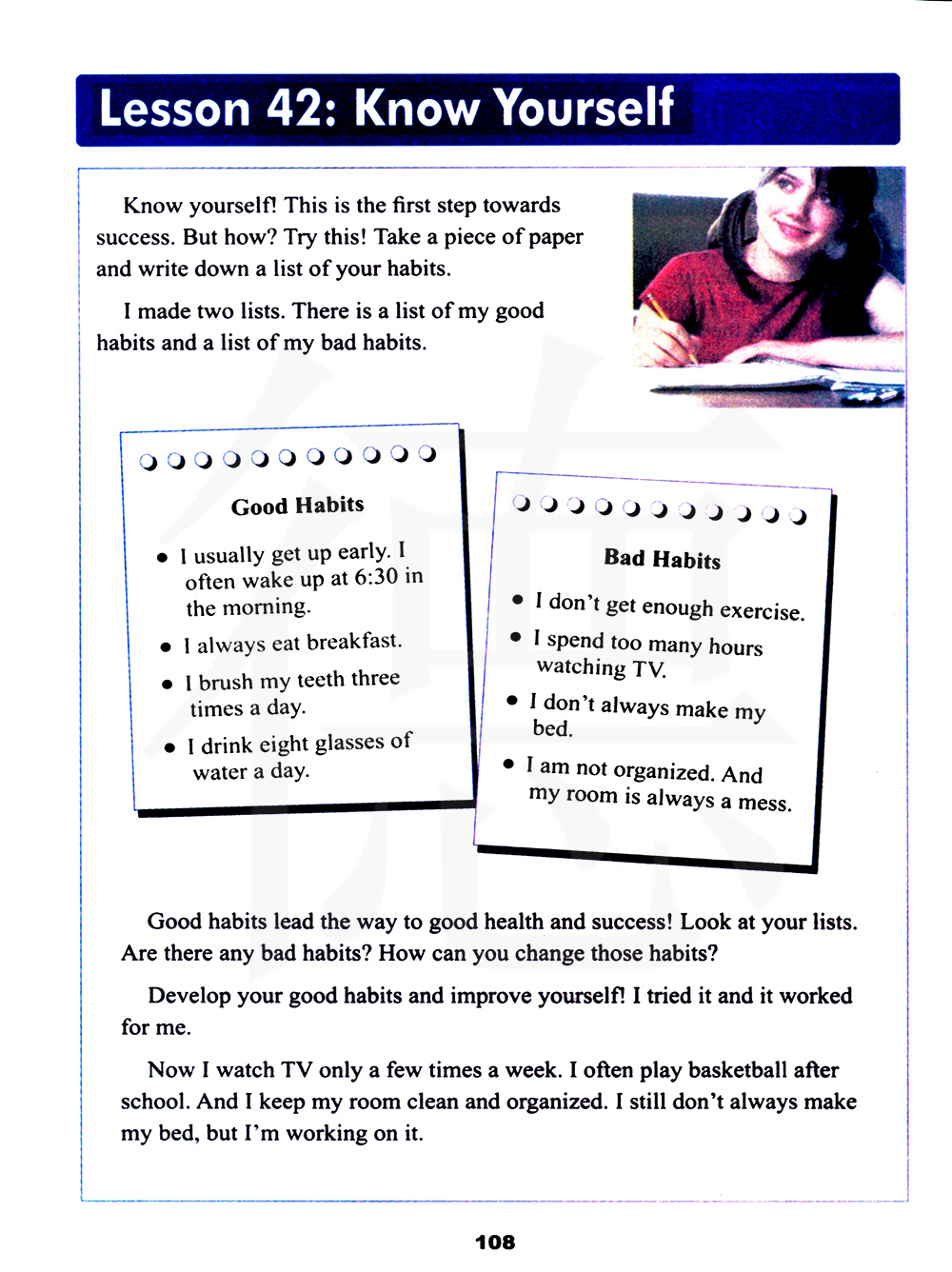 现在每周很少电视。放学后,我经常打篮球。并且我保持我的房间干净整洁。我仍然总是不叠杯子,不过我正努力。