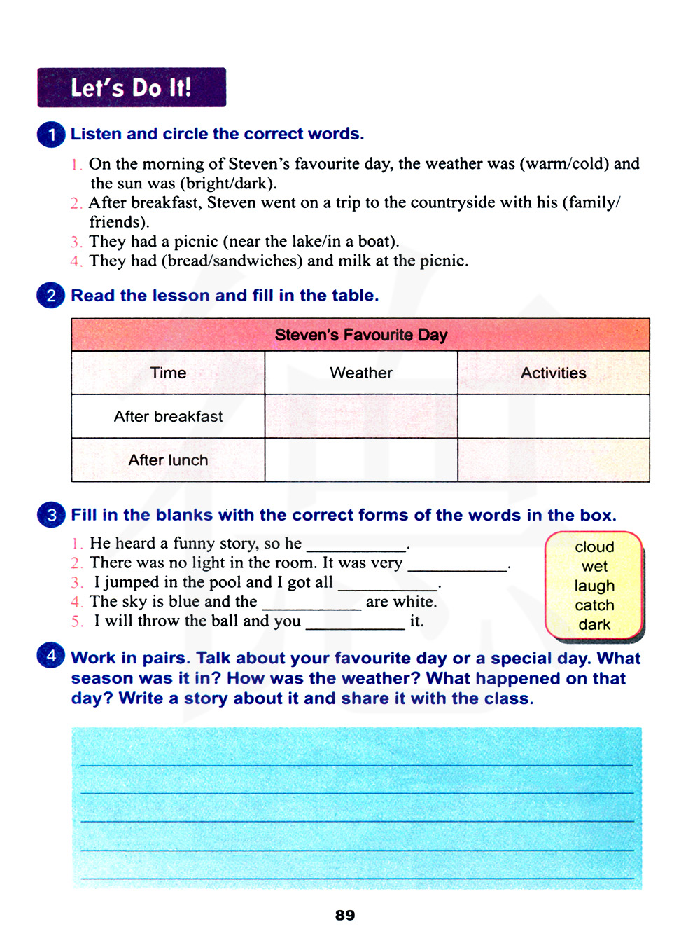 小组练习。谈论你最喜欢的一天或特别的一天。它在哪个季节里?天气怎么样?那天发生了什么?写一个关于它的故事并和全班一起分享。