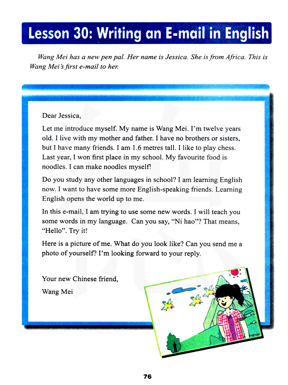 王梅有一个新笔友。她名叫杰西卡。她来自非洲。这是王梅第一次给她写邮件。