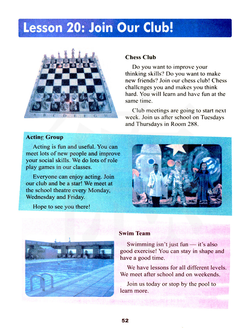每一个人都可以喜欢表演。参加我们的俱乐部,成为一位明星!每周一、周三和周五我们在学校剧院见。