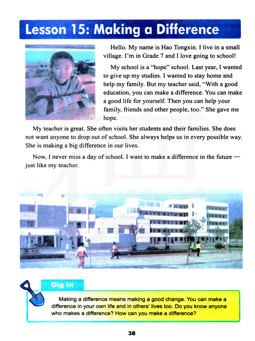 现在我从不耽误上学时间。我想在将来有所作为——就像我的老师一样。
