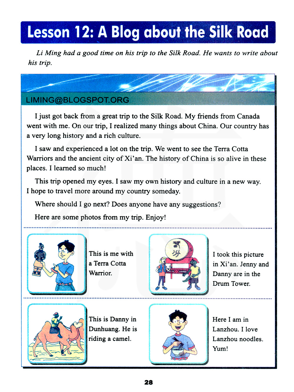 我刚从很棒的丝绸之路旅行回来。我来自加拿大的朋友们和我去的。旅行中,我发现了有关中国的很多东西。我们的国家历史悠久并且文化丰富多彩。