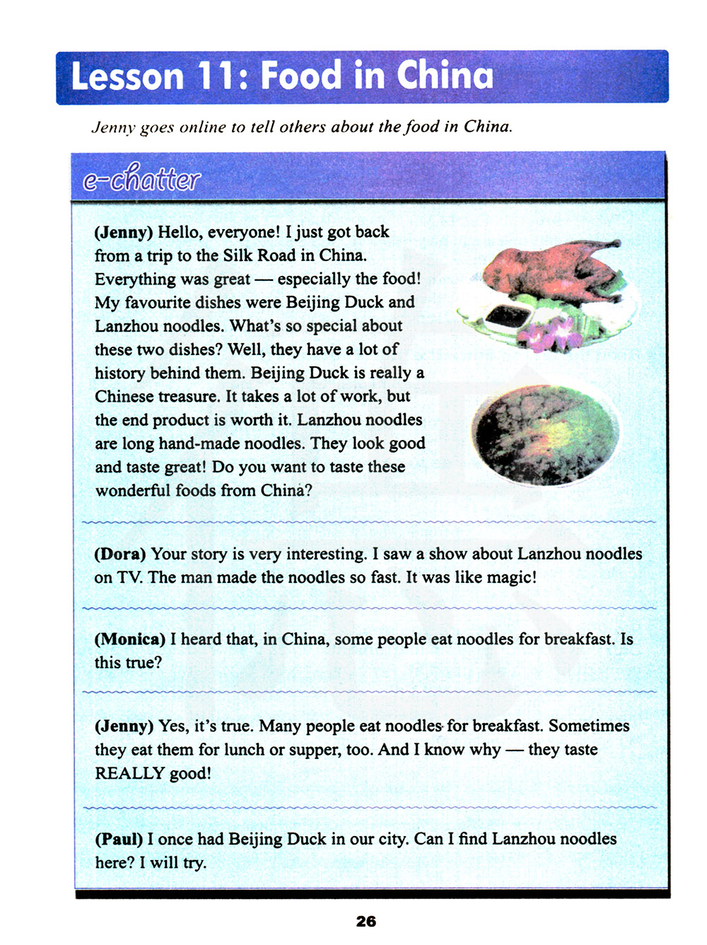 大家好!我刚从中国的丝绸之路旅行回来。所有的食物都棒极了——尤其是中国的食物!我最喜欢的食物是北京烤鸭和兰州拉面。这两种食物有什么特别的吗?嗯,它们背后有很多历史。北京烤鸭真的是中国的珍品。它做起来很费事,但是最终产品是值得的。兰州拉面是手工的长面条,他们看起来不错而且尝起来很棒 !你想尝尝来自中国的这些美味的食物吗?