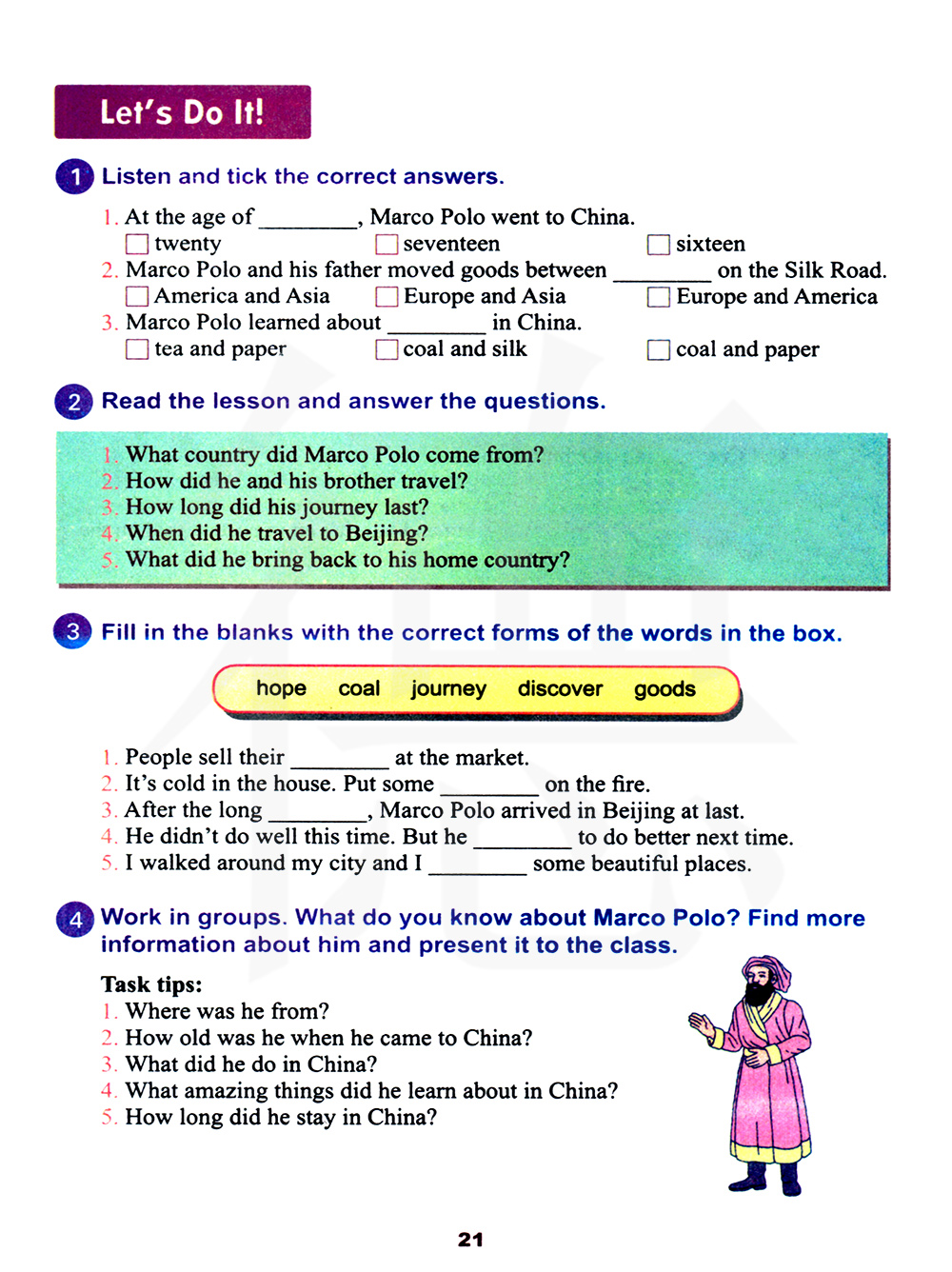 小组练习。关于马克.波罗,你知道什么?找出更多关于他的信息。并在全班介绍。