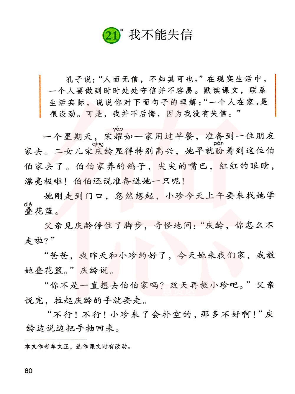 本文讲述的是宋庆龄小时候诚实守信的故事。一个星期天,宋庆龄全家准备到父亲的一位朋友家去。可是宋庆龄想起要在当天教朋友小珍叠花篮,虽然父亲和母亲都劝她改天再教,可是宋庆龄还是留了下来,履行了自己的诺言。