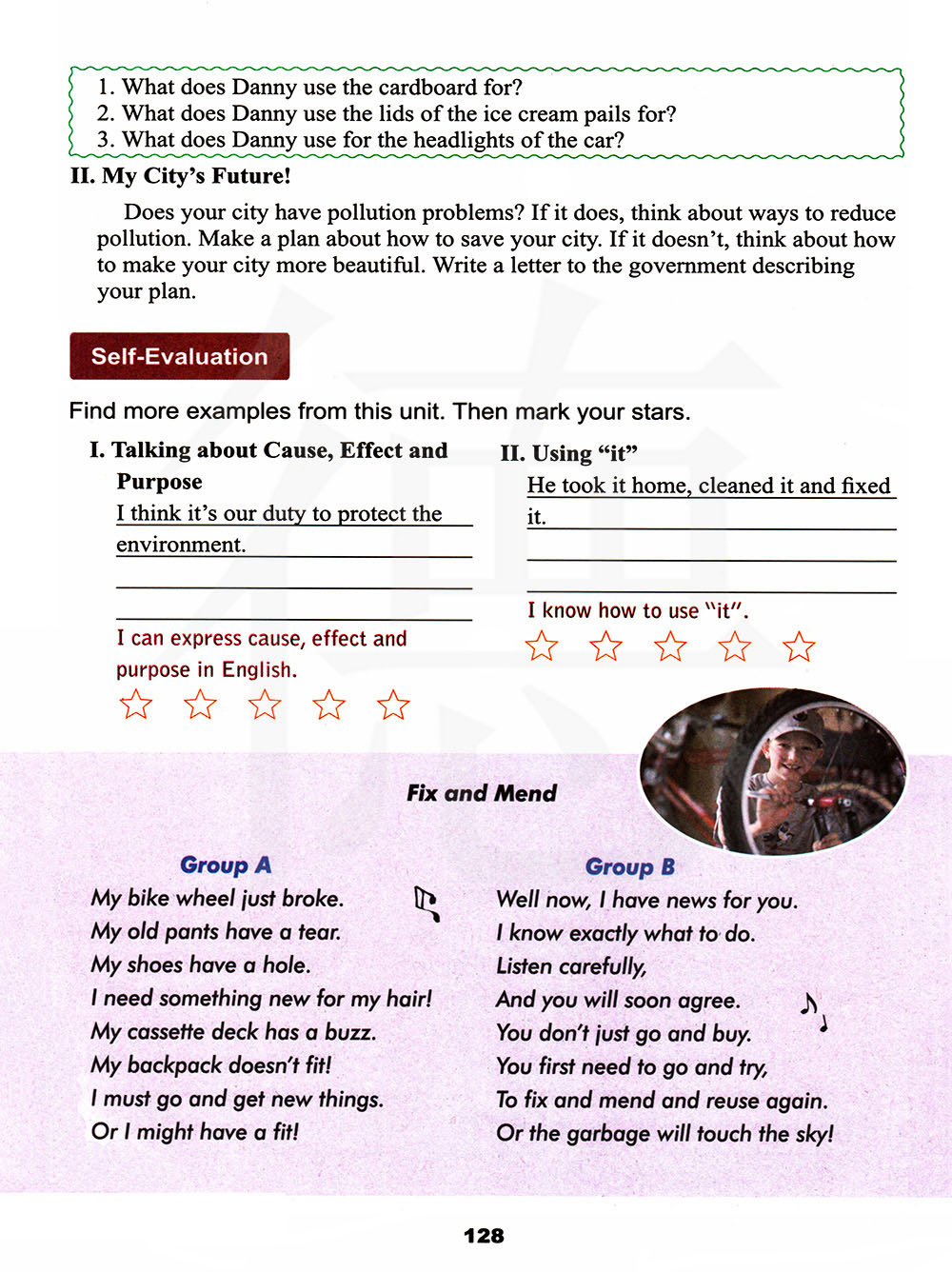 A组 我的自行车轮子坏了。我的旧裤子有一条裂缝。我的鞋子有一个洞。我想改变我的发型!录音机嗡嗡响。我的背包不适合!我必须去买新的东西。否则我会大发脾气!B组 现在,我有消息要告诉你。我知道该做什么。仔细听,你很快就会同意。你不需要去买。首先你需要去尝试,修一修,补一补,重新使用。否则垃圾就要堆到山上去了!