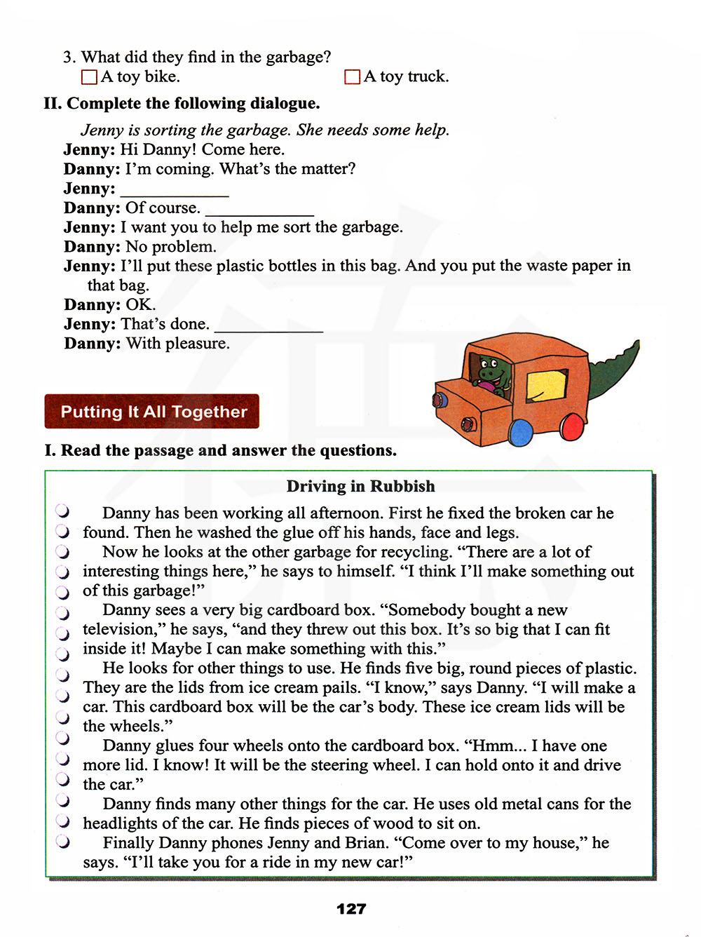 丹尼整个下午都在忙着。首先他修理他找到的坏汽车。然后他洗掉他手上、脸上和腿上的胶水。