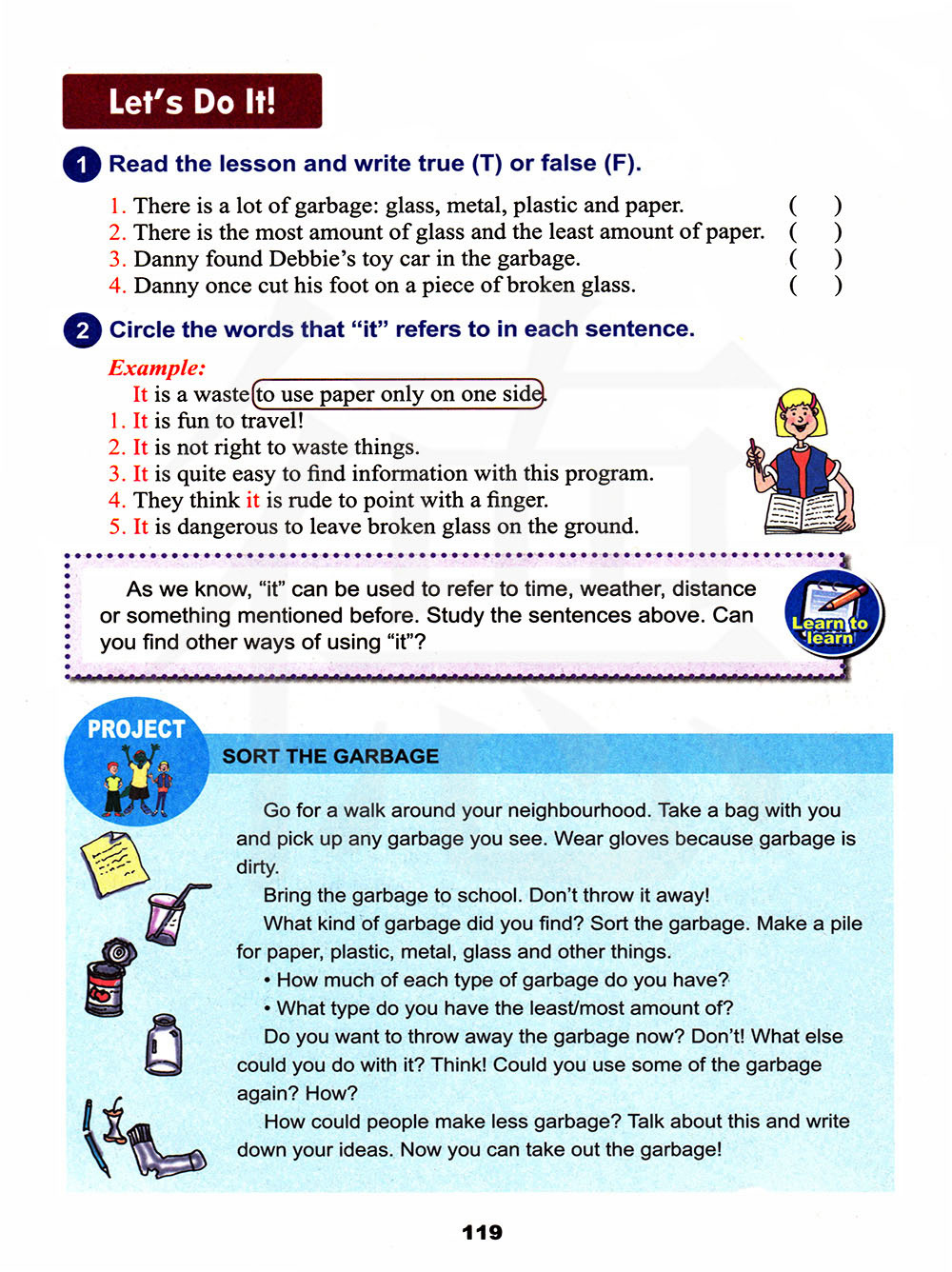 人们怎样才能制造更少的垃圾?谈论这个问题,并把你的想法写出来。现在你可以把垃圾拿出来了!