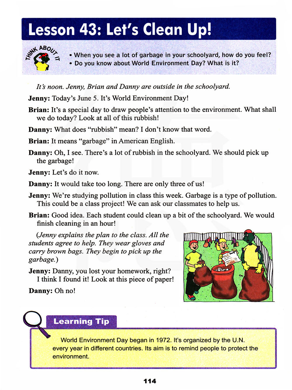 珍妮向全班同学解释了这个计划。所有的同学们都同意去帮忙。他们戴上手套,拿起棕色的袋子。他们开始去捡垃圾。