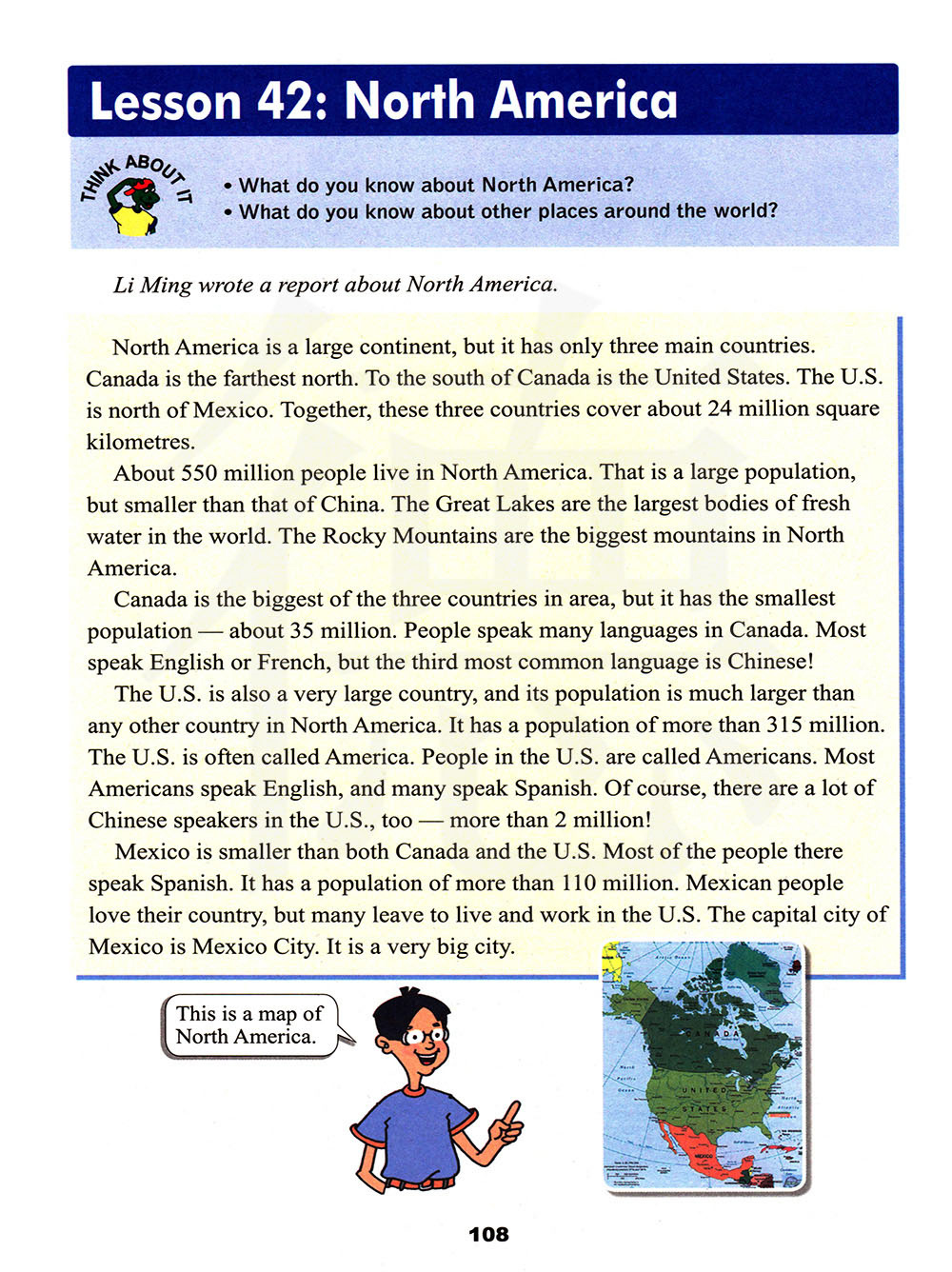 美国也是个非常大的国家,它的人口数量比北美洲其他国家都要大得多。他的人口数量超过315 000 000。美利坚合众国常常被称为美国。居住在美国的人们呗称为美国人。大多数美国人说英语,还有许多说西班牙语。当然,美国还有很多说中文的人——超过2 000 000人!