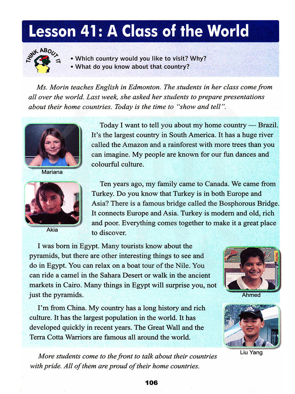 莫里老师在埃德蒙顿教英语。她班级里的学生们来自世界各地。上周,她让她的学生们准备一份关于他们祖国的介绍。今天到了“展示和讲述”的世界了。