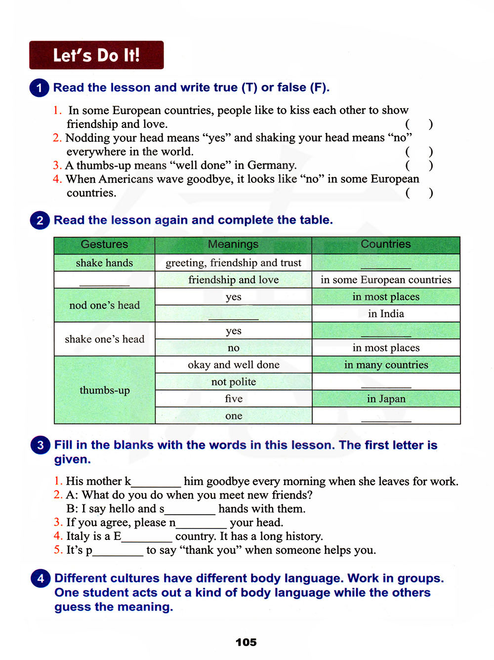 不同的文化有不同的肢体语言。小组练习。一个同学表演一个肢体动作,其他同学猜出它的意思。