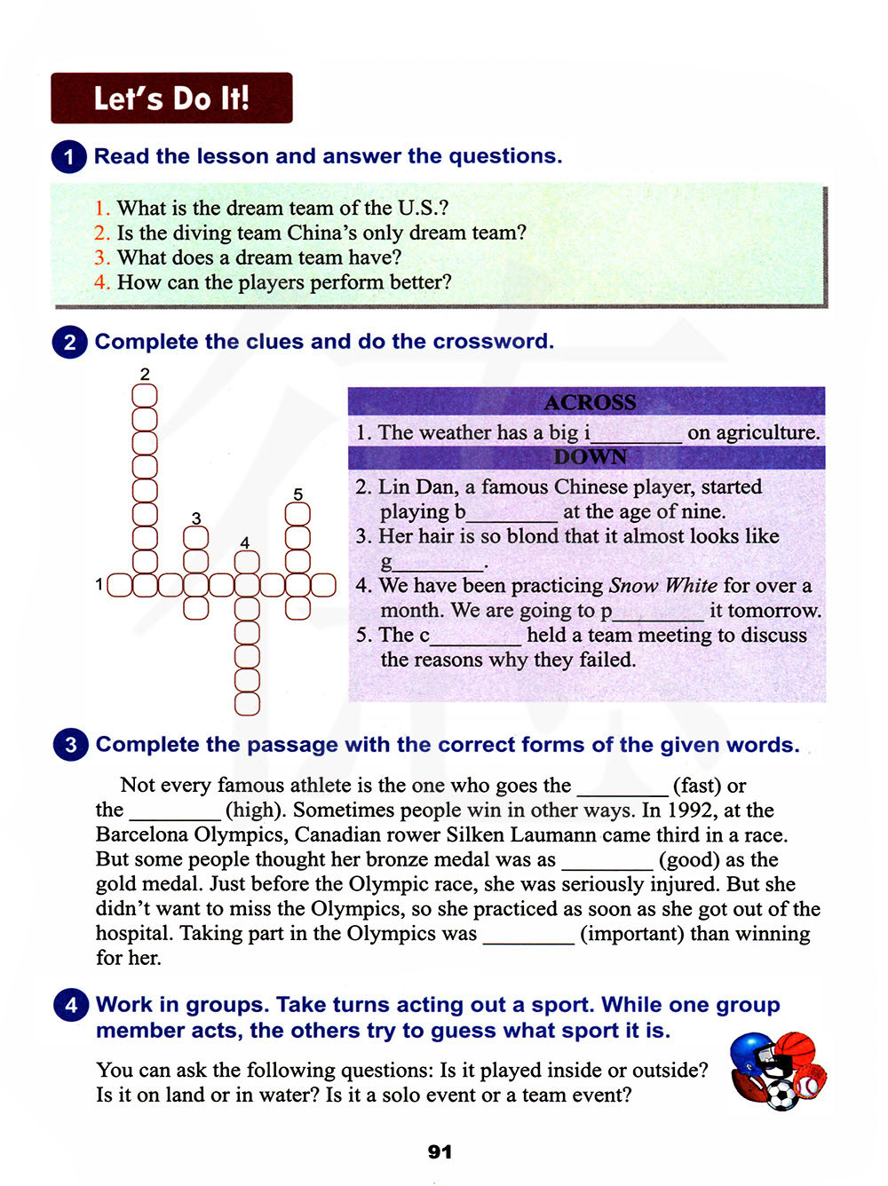 小组练习,轮流表演一项运动。当一个成员表演时,其他人试着猜出它是什么运动?