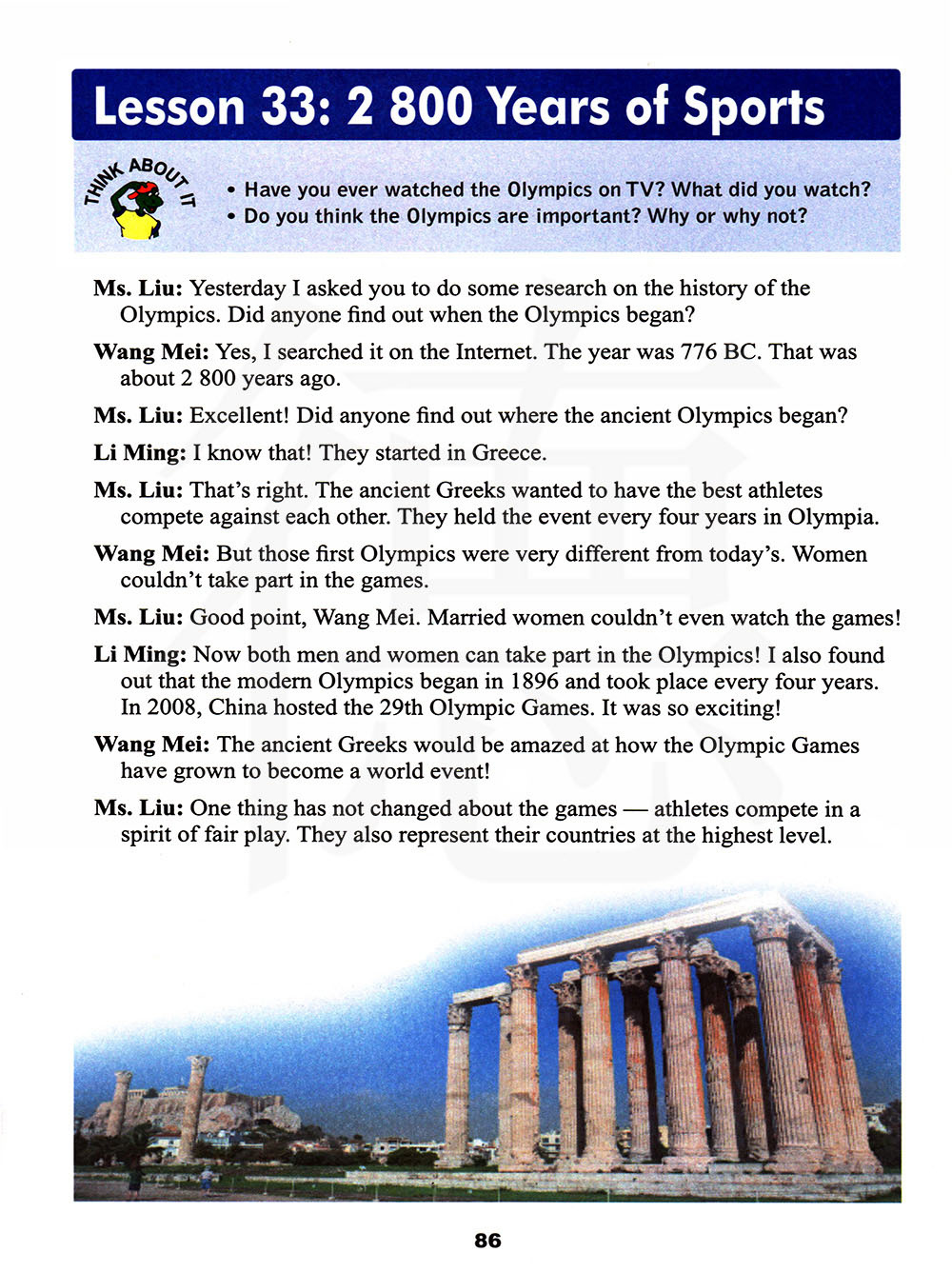 昨天我让你们对奥林匹克运动会的历史做些研究。有没有人知道奥林匹克运动会开始于哪一年?