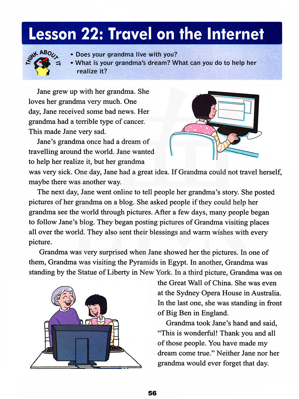 当简给奶奶看照片时,奶奶非常惊奇。在其中一张照片,奶奶在参观埃及金字塔。在另一张中,奶奶站在纽约的自由女神像旁边。在第三张照片中,奶奶在中国的长城。她甚至在澳大利亚的悉尼歌剧院。在最后一张,她站在英国的大本钟前。