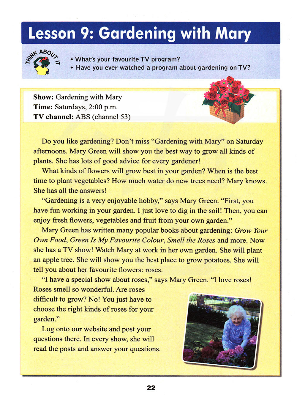 玛丽·格林著有许多受欢迎的关于园艺的书:《种你自己的食物》、《绿色是我最喜欢的颜色》、《闻着玫瑰》及更多。现在她有了电视节目!在玛丽自己的花园里看她工作。她将种一棵苹果树。她将给你展示种土豆的最好的地方。她将给你说说她最喜欢的花:玫瑰。