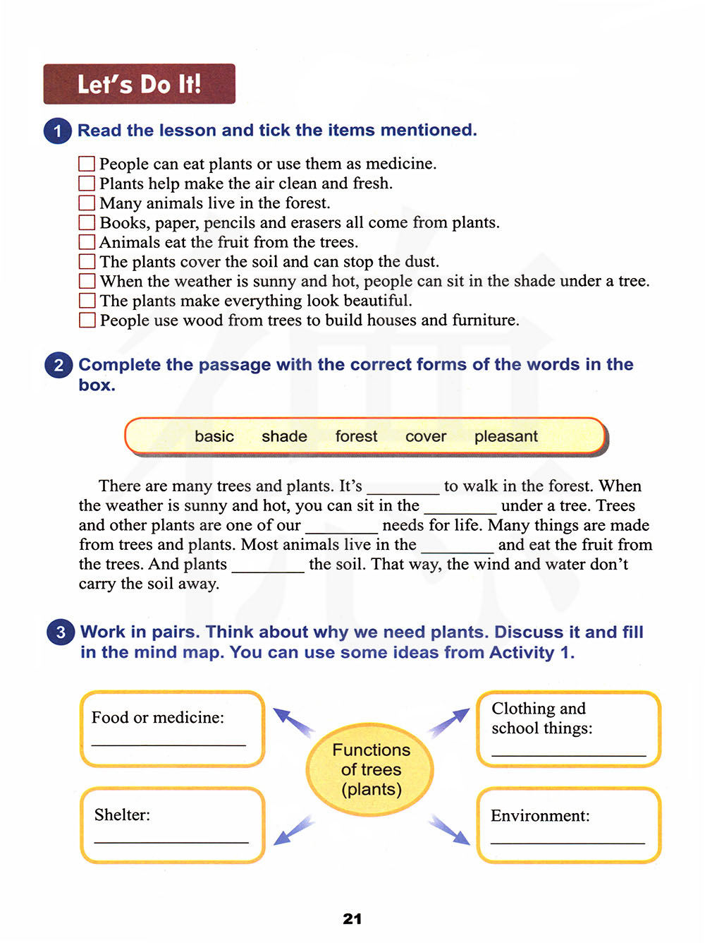 许多动物住在森林里。书本、纸张、铅笔和橡皮擦都来自植物。