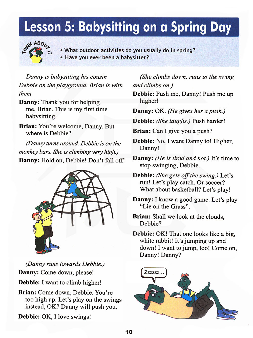 (她从秋千上下来。)我们跑步吧!我们传球玩。或者踢足球?篮球怎么样?让我们来玩吧!
