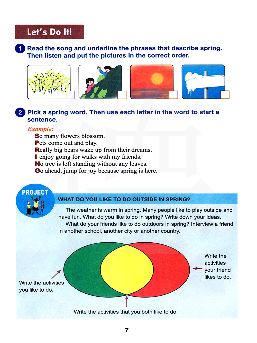 读一读这首诗,画出描述春天的短语。然后听一听,给图片排序。