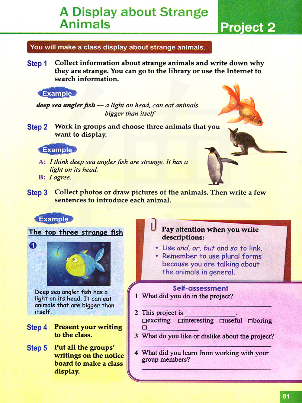 收集动物的图片或画出奇异动物,然后为每个动物写几句介绍的句子。