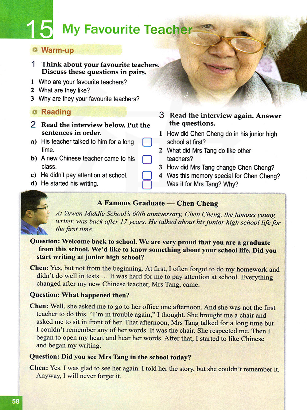 陈:是的,但不是从一开始。起初我经常忘记做作业,考试也考不好。我在学校很难集中注意力。我的新语文老师唐老师来了以后,一切都变了。