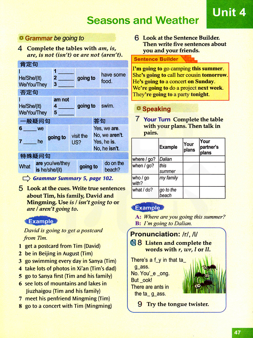 看一看下面的提示,写出关于蒂姆、他的家人、大卫和明明的正确句子。使用is/ isn't going to或are/are't going to。