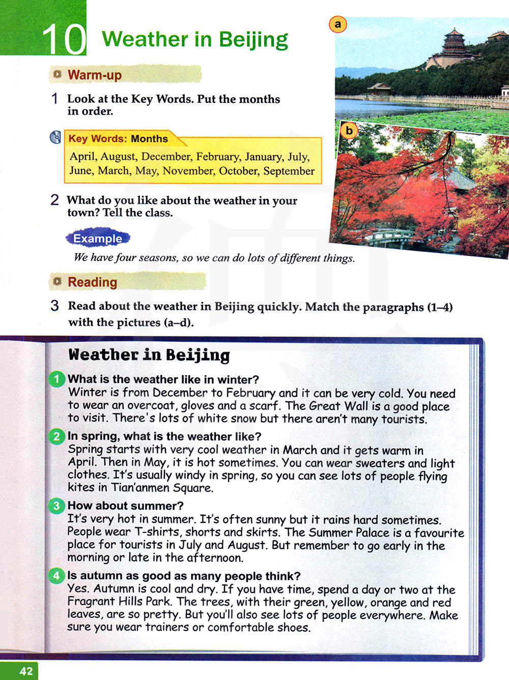 快速阅读关于北京天气的文章,将文章的1-4段与a-c四幅图匹配起来。