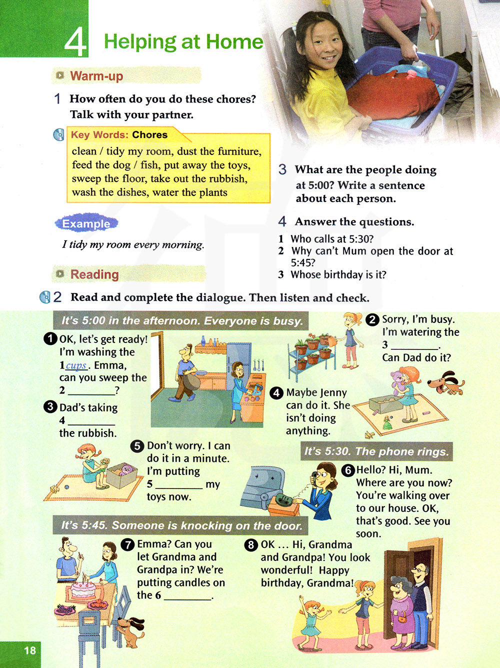 关键词:家务活 清洁/整理我的房间、清扫家具上的灰尘、喂狗/鱼、收起玩具、拖地、扔垃圾、洗碗、浇灌植物。