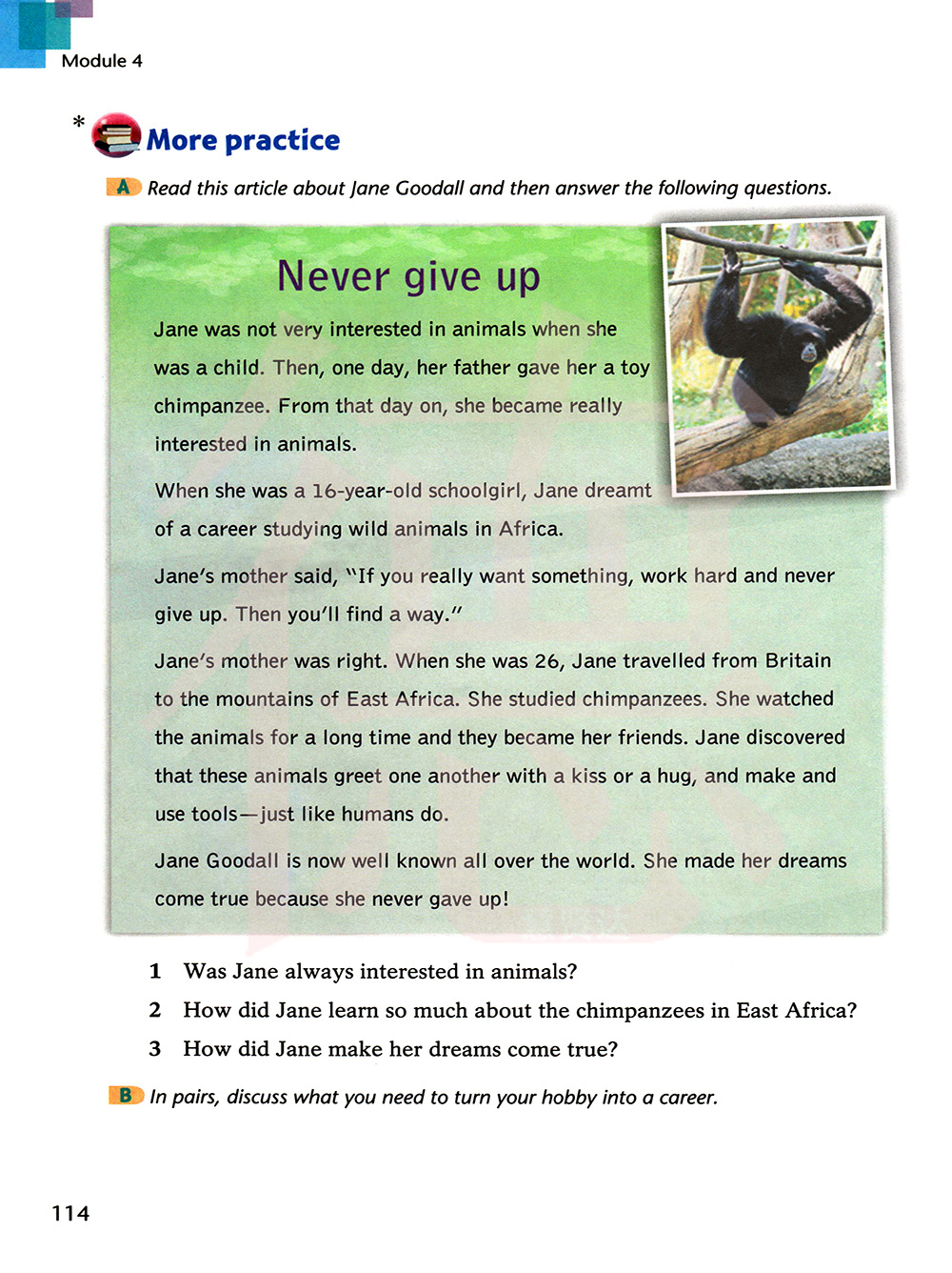 简的母亲是正确的。26 岁时,简从英国前往东非的山区。她研究黑猩猩。她长时间观察野生动物,它们成了她的朋友。简发现这些动物们用一个吻或拥抱来互相打招呼,并会制造和使用工具——就像人类一样。