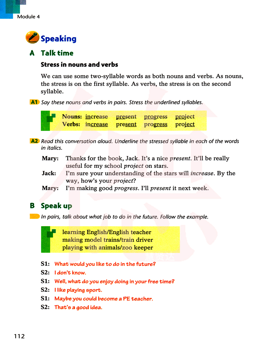 大声朗读这段对话。划出斜体单词的重音音节。