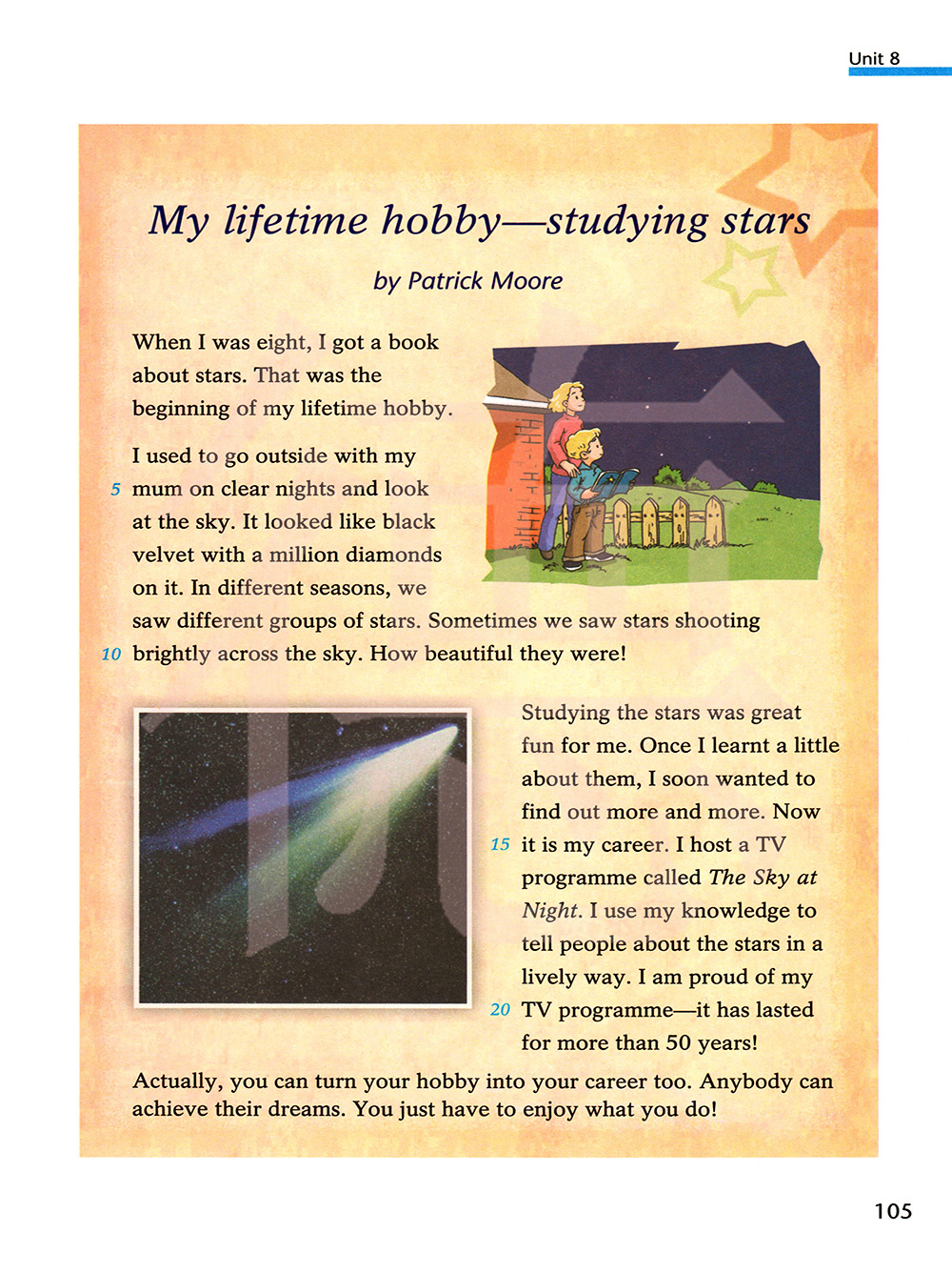 研究星星对我来说充满了乐趣。当我学到了一点关于他们的知识,很快我就想知道得更多。现在这成了我的职业。我主持了一个名为《夜空》的电视节目。我用我的知识,以一种生动的方式让人们了解星星。我以我的电视节目而自豪——它已经持续了 50 多年了。
