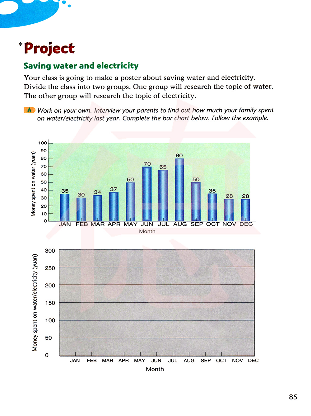独立行动。采访你的父母,找出去年你家用了多少水/电费。完成下面的条形统计图。
