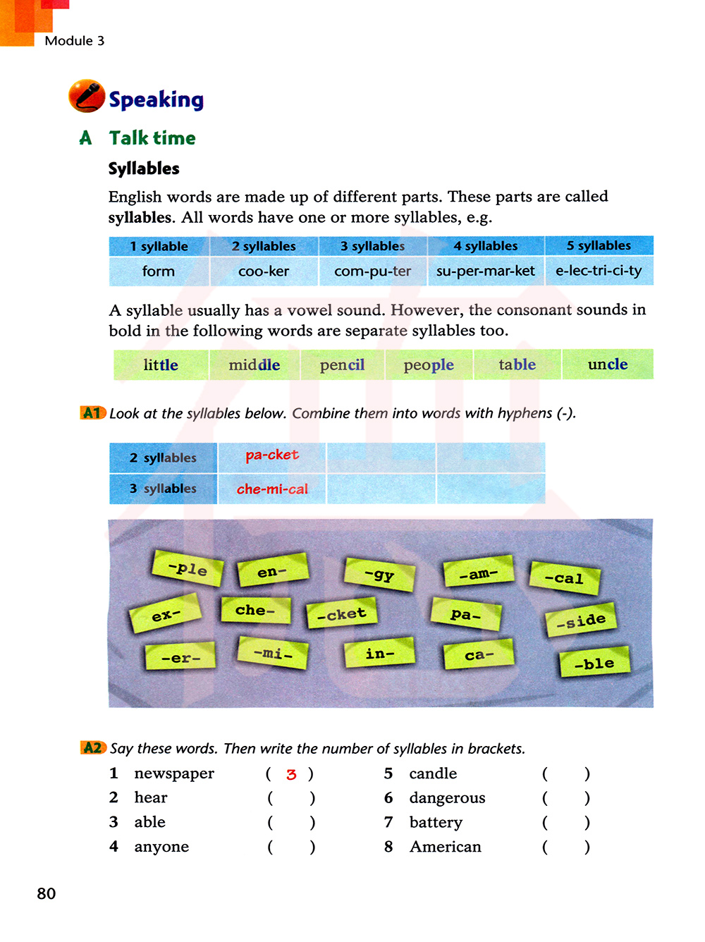 说这些单词。然后在括号里写上音节的号码。