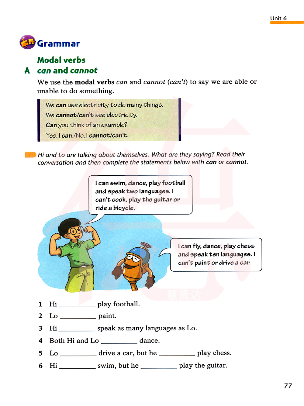 海和罗在谈论他们自己。他们在说什么?阅读它们的对话,然后用can或cannot完成句子。