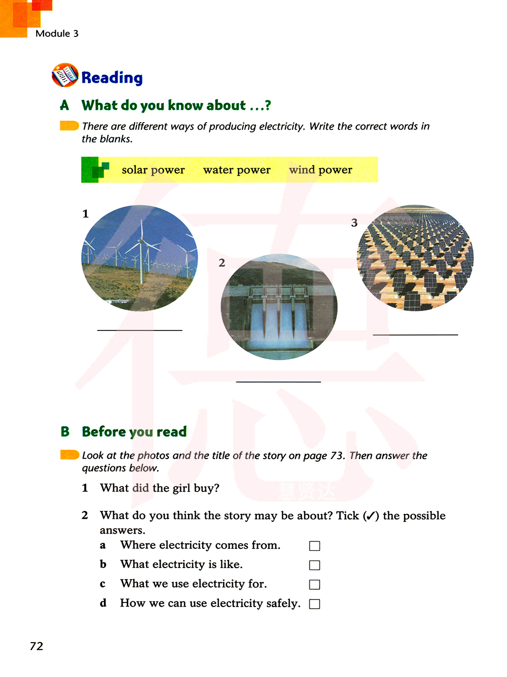 有三种发电的方式。在空格里写上正确的单词。