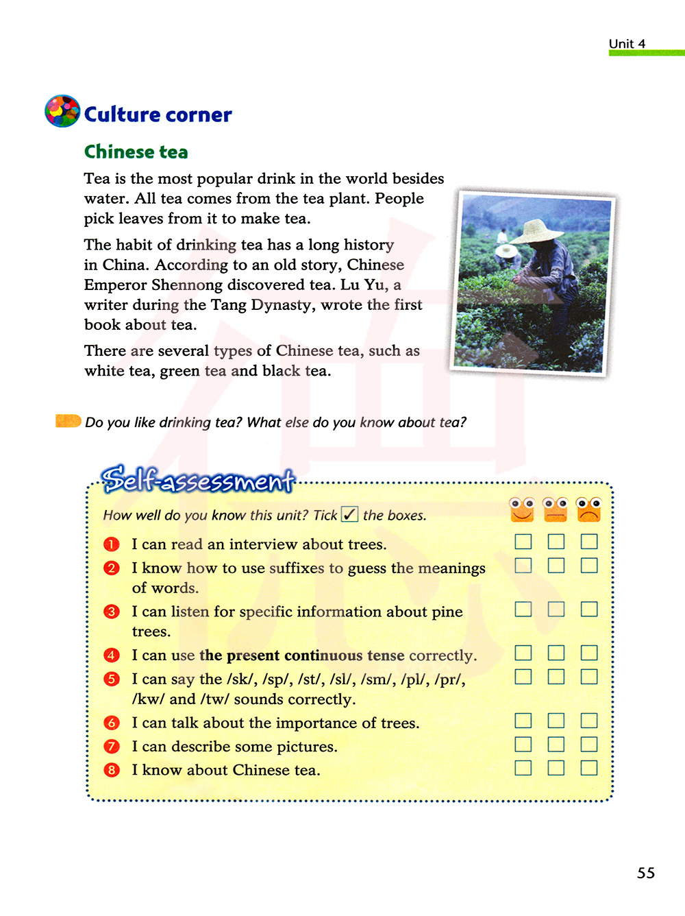 茶是世界上除了水之外最流行的饮品。茶是世界上除了水之外最流行的饮品。人们(从茶树上)采摘叶子来制茶。