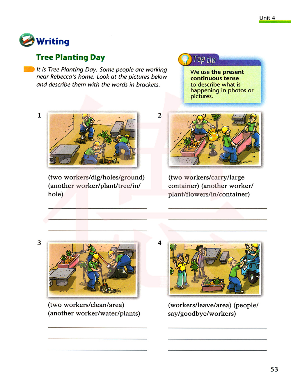 今天是植树节。有的人在丽贝卡家附近忙开了。看图,用括号里的单词来描述他们。