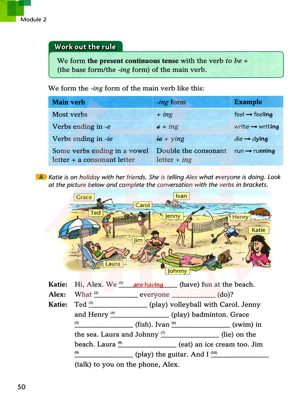 凯蒂在和他的朋友们度假。她在告诉艾利克斯每个人分别在做什么。看图,用括号里动词完成对话。
