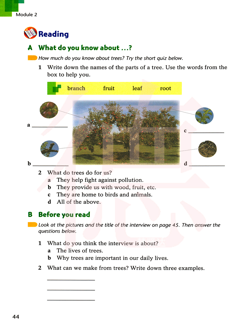 写下树的各部位的名称,使用方框中的单词来帮助你。