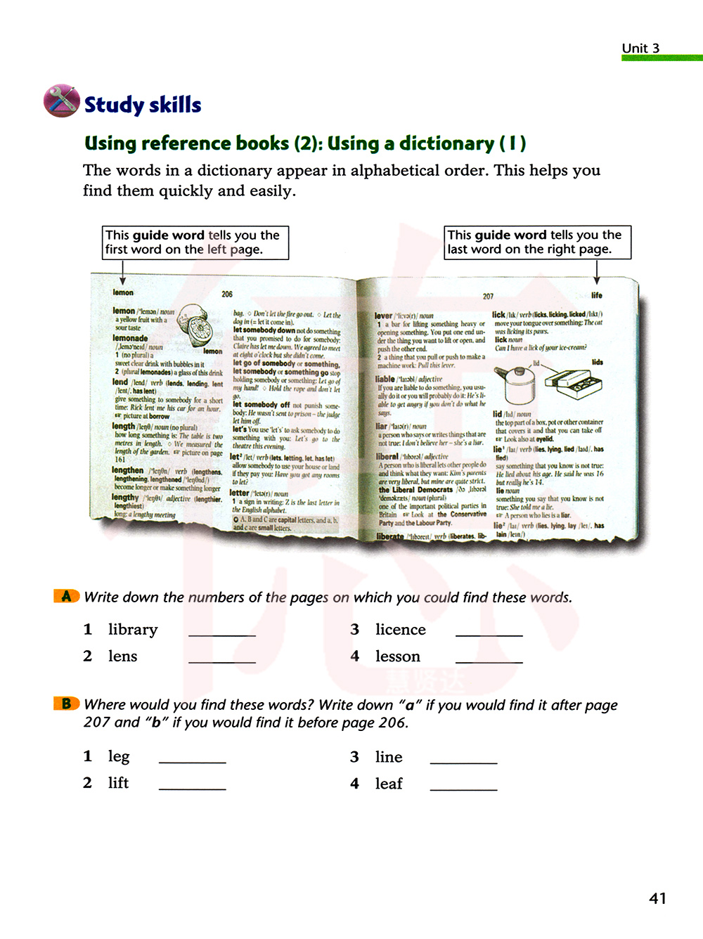 你在哪里可以找到这些单词?如果你在第207页找到某个单词,在它的后面标上a;如果在第206页前找到它,则标上b。