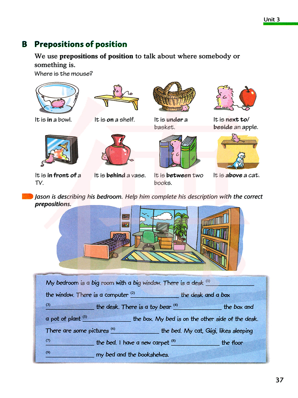 帮助他用正确的介词完成他的描述。