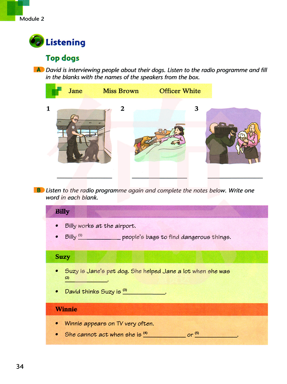 戴维在采访人们关于他们的狗。听这个电台节目并用方框里说话者的名字来填空。