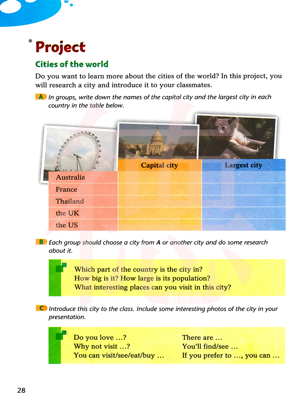 你想更多的了解世界各地的城市吗?在这个课题中,你要对一个城市进行调查研究并向你的同学介绍这个城市。